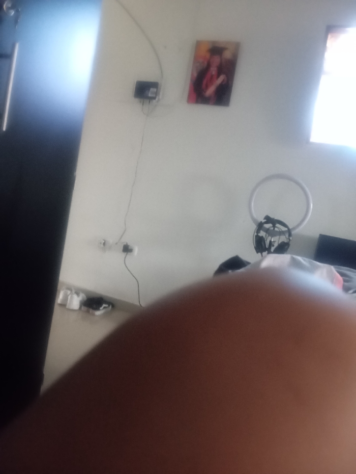 A blurred foreground dominates the view, possibly a part of a person. Behind it, a room scene unfolds. A dark wardrobe stands on the left. A white wall hosts an electrical outlet, a graduation photo, and a circular light fixture. A window emits bright light in the upper right. On a surface below, shoes and other objects are visible, partially obscured.