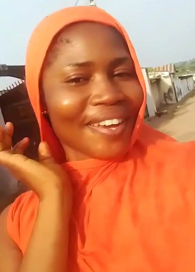 A person with dark skin and white teeth smiles at the camera. They are wearing an orange headscarf and shirt. They hold one hand up near their face. They are outside on a bright day. Behind them are buildings and power lines.