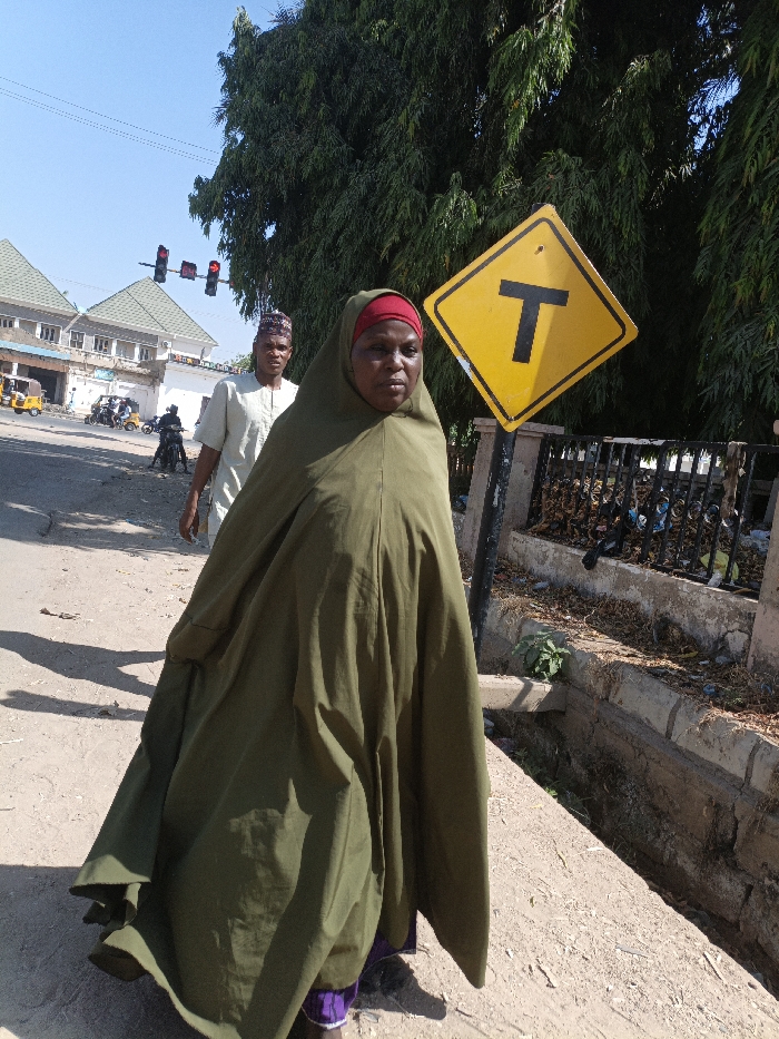 The image portrays an outdoor street scene in Tarauni, Nigeria, under clear daylight. In the foreground, a woman walks on a dirt path, facing slightly right with a neutral expression. She wears an olive-green khimar covering her body, with a red headscarf visible beneath it. Behind her, a man walks further back on the left side of the frame, wearing a light-colored tunic and a patterned cap. To the woman's right, a yellow diamond-shaped road sign displaying a black 'T' symbol is mounted on a pole, positioned in front of dense green foliage. Below the sign is a low dark metal fence and a concrete drainage channel. In the background, a paved road is visible, populated by several tricycles and motorcycles. Above the road, a traffic light structure exhibits three active red lights. Distant buildings with green sloped roofs are discernible behind the road. Distinct shadows are cast on the ground due to direct sunlight.