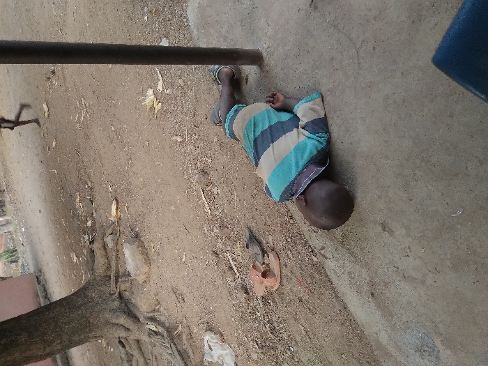 A child lies on a dirt and concrete surface. He wears a striped, short-sleeved shirt and has dark skin. His head is turned away from the camera. A pair of sandals lie near the child's feet. Part of a tree trunk and roots are visible on the left side of the frame, while a metal pole extends from the top left. A blue object is in the top right corner. The area appears to be outdoors.