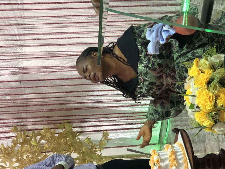 woman, possibly in her 40s, with dark skin and black hair, wearing a green patterned dress with a black collar, standing in front of a glass podium and a red and white beaded curtain. She is speaking with her eyes closed and her mouth open, as if in prayer or song. She is holding a blue cloth in her right hand and a silver spoon in her left hand. A cake is visible on a table to the left of the woman. A bouquet of yellow flowers and white flowers is visible to the right of the woman. The coordinates (latitude: 5.565, longitude: -0.323) place this image in a church or auditorium in the city of Weija, Ghana.