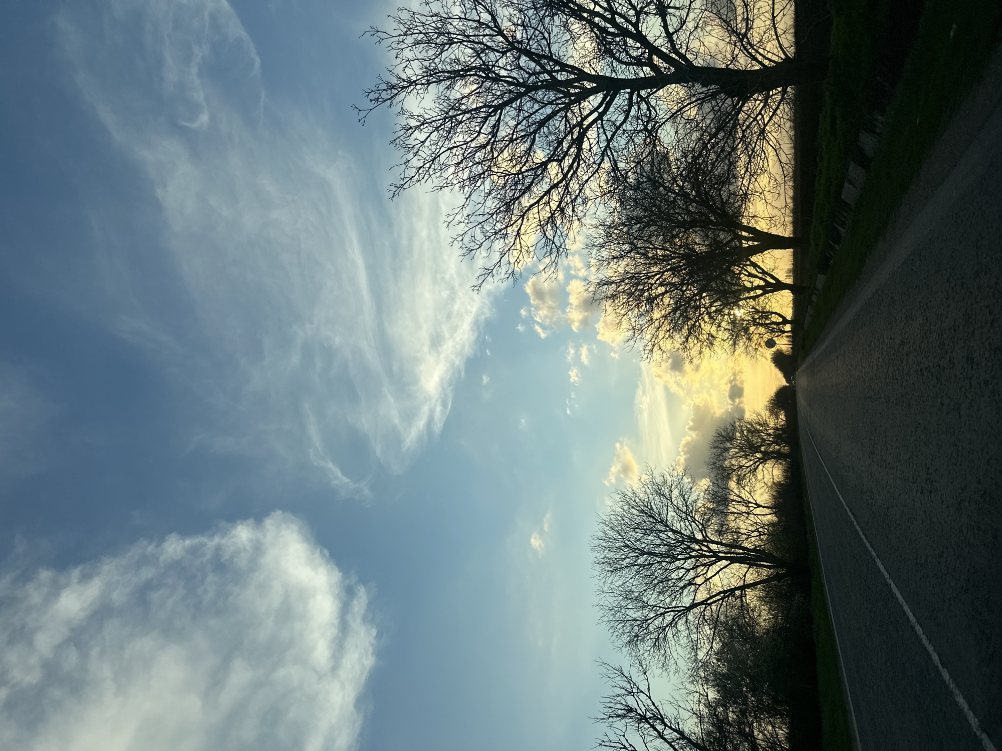 A low-angle shot of a straight, paved road receding into the distance under a partly cloudy sky at sunset. Bare trees are silhouetted against the bright sky on either side of the road. The scene is likely in a rural area of Brashlen, Bulgaria due to the presence of natural landscape elements. There is no presence of any people or other objects in this scene.
