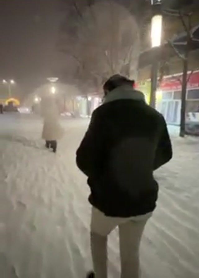 person walking through a snow-covered street at night. The street is lined with buildings and streetlights. Other people are walking in the same direction. The person filming is walking behind another person, and the ground is covered in deep snow. The video is shaky, and the view is obscured by the falling snow.