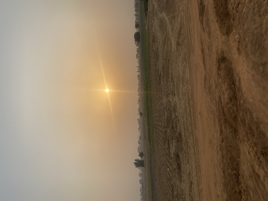 landscape during either sunrise or sunset. The sun is positioned centrally in the sky, emitting bright rays through a hazy atmosphere. To the right, a field dominates, displaying a mix of tilled earth and rows of sparse vegetation. Along the horizon, a line of trees is visible, their forms blurred by the distant haze. The sky transitions from a bright golden color around the sun to a lighter, almost white hue towards the edges.
