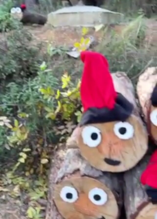 collection of carved wooden figures in a forested area. The figures are made from cross-sections of tree trunks, each painted with a simple face and topped with a red hat. The figures are stacked on top of each other. The area surrounding the figures is a dirt path, lined with green bushes. In the background, there is a wooden structure that looks like a picnic table, as well as additional greenery and trees. There is a child speaking in the background.