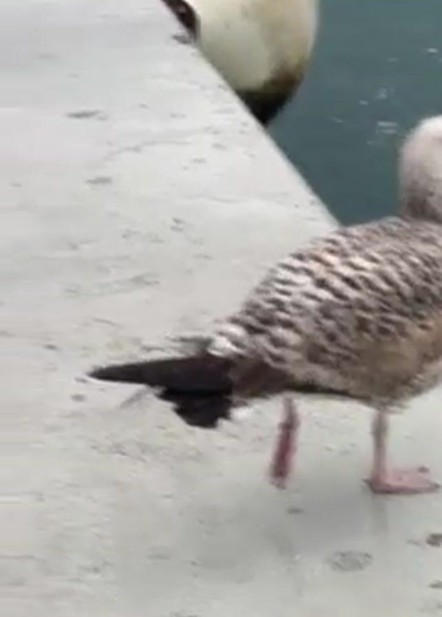 The video opens with a close-up of a young seagull standing on a concrete pier
