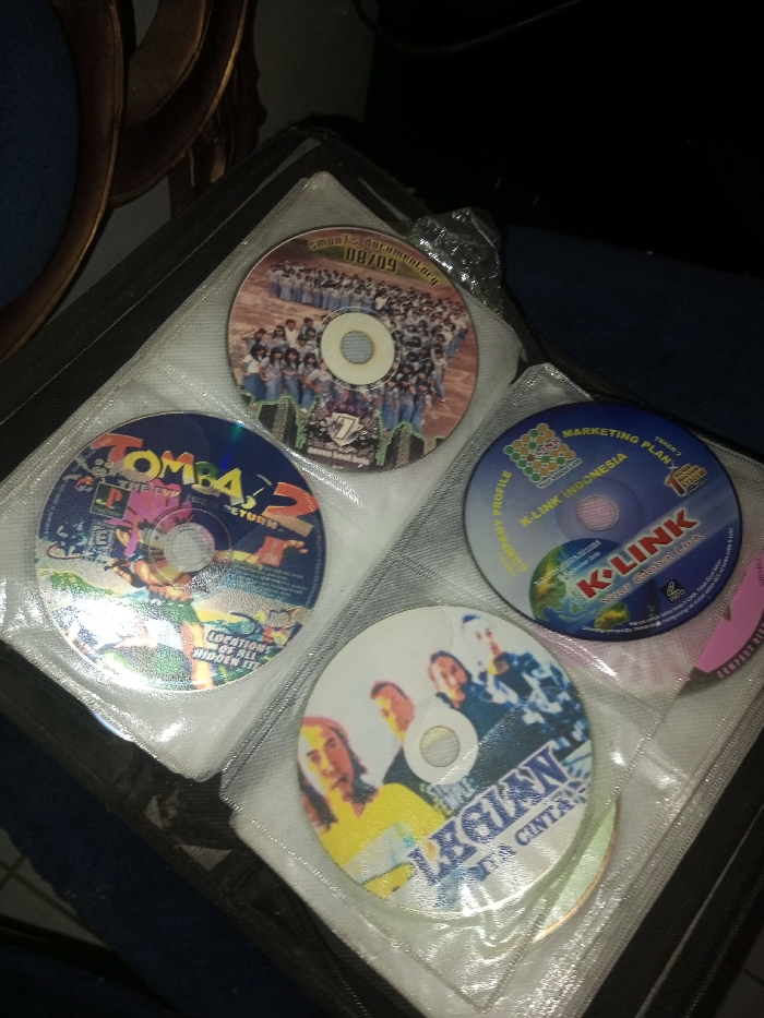 CD case filled with various discs. One disc appears to be a game titled "Tomb Raider 2," while another features a large group of people, likely a school or organization, with the date "08/09" visible. A "K-LINK Indonesia" marketing disc is also present. Finally, there is a disc with a band or group photo, labeled "Legian Cinta Cinta," indicating a music or promotional item. The discs are encased in plastic sleeves within the CD case.