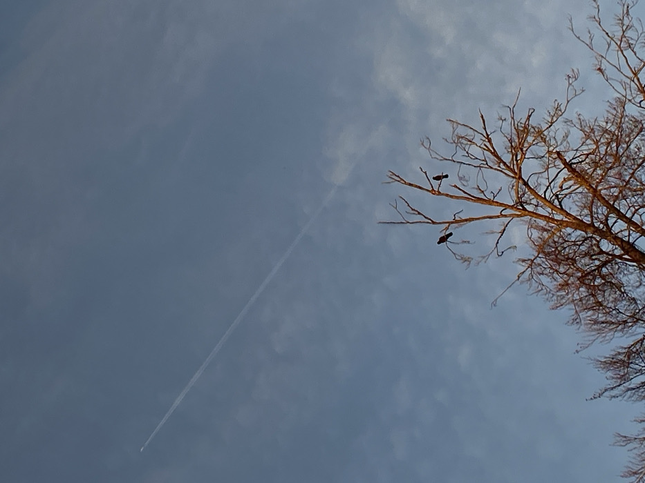 The image displays a sky view above Glattbrugg, Switzerland. A light blue sky, featuring scattered thin cloud formations, dominates the background. A single white aircraft contrail extends diagonally from the upper left quadrant towards the lower right. The upper portion of a bare, deciduous tree occupies the lower and right sections of the frame; its intricate, leafless branches exhibit an orange-brown hue from warm, low-angle illumination. Two dark-colored birds are perched on separate bare branches within the tree's upper canopy. No human figures or additional man-made structures are visible. The primary actions depicted are the aircraft's passage, indicated by its contrail, and the birds resting on the tree branches.