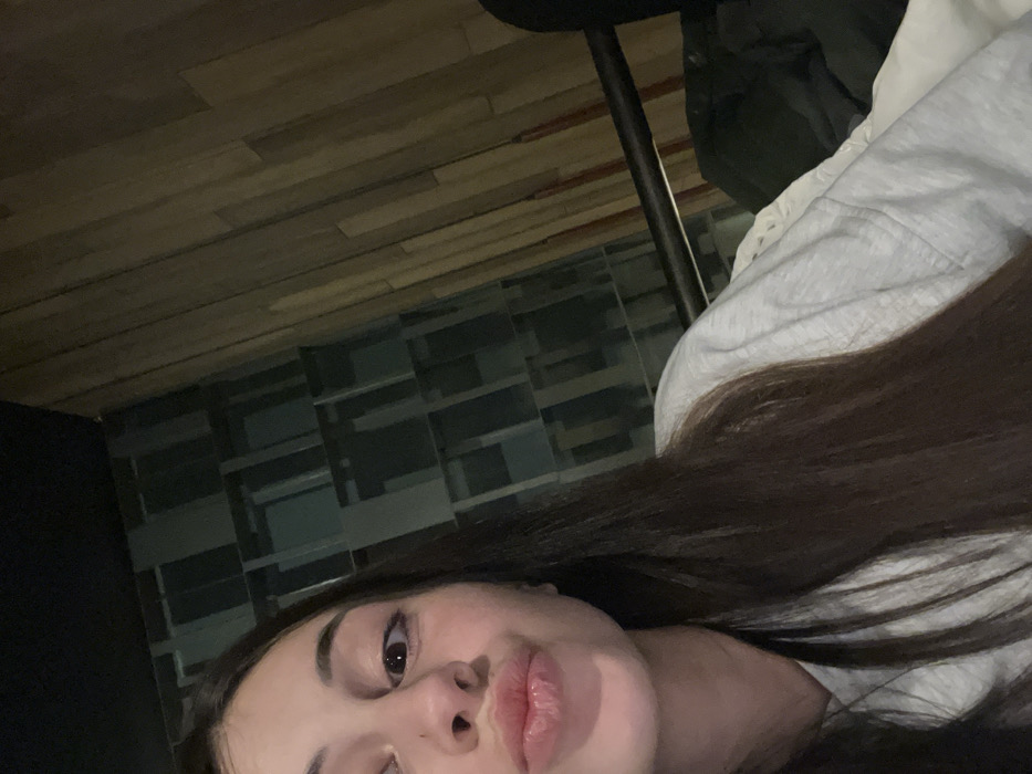 The image displays a close-up, angled view of a female subject, occupying the left half of the frame. She has long, dark hair, dark eyes, and a small stud piercing in her right nostril. Her lips are puckered, and she is looking directly into the camera. She wears a light grey long-sleeved top. The background consists of a large, dark multi-paneled window structure on the left and a vertical wall constructed from light brown wooden planks on the right. A dark horizontal railing or bar is visible across the mid-ground, positioned behind the subject. A dark, crumpled object, possibly clothing, is visible below the railing on the lower right. The overall scene is dimly lit and appears to be an indoor setting. The location is in the city of Unknown, Unknown.