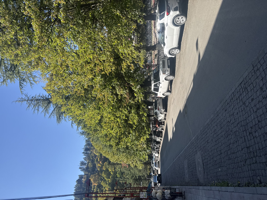 The image displays a street scene in Borjomi, Georgia, on a clear, sunny day, likely depicting Rustaveli Street near the entrance to Borjomi Central Park. The perspective is from a low angle, looking forward along the road. On the left, a cobblestone sidewalk is partially shadowed, adjacent to a commercial structure. A red metal framework, consistent with a vendor stall or part of the cable car station infrastructure, is visible, displaying several light-colored, spherical objects resembling felt hats. Utility lines run vertically in the upper left corner. The asphalt road occupies the center and right side of the frame. A line of approximately ten vehicles is parked along the right curb, facing generally away from the camera. The closest vehicles include a white compact SUV (possibly a Toyota C-HR or similar) and a white Land Rover Discovery. Further down the line, various sedans and at least two distinctive open-top utility vehicles, resembling golf carts or tourist buggies (one dark, one red), are present. No vehicle occupants or active traffic movement are discernible. Along the right side of the road, a dense row of mature deciduous trees with vibrant green foliage provides significant shade, casting long shadows across the street. Behind these trees, a white decorative fence or railing is partially visible. The background features a steep, tree-covered hillside with a mixture of green and nascent autumnal foliage under a clear, bright blue sky. No individuals or specific actions are evident within the frame.