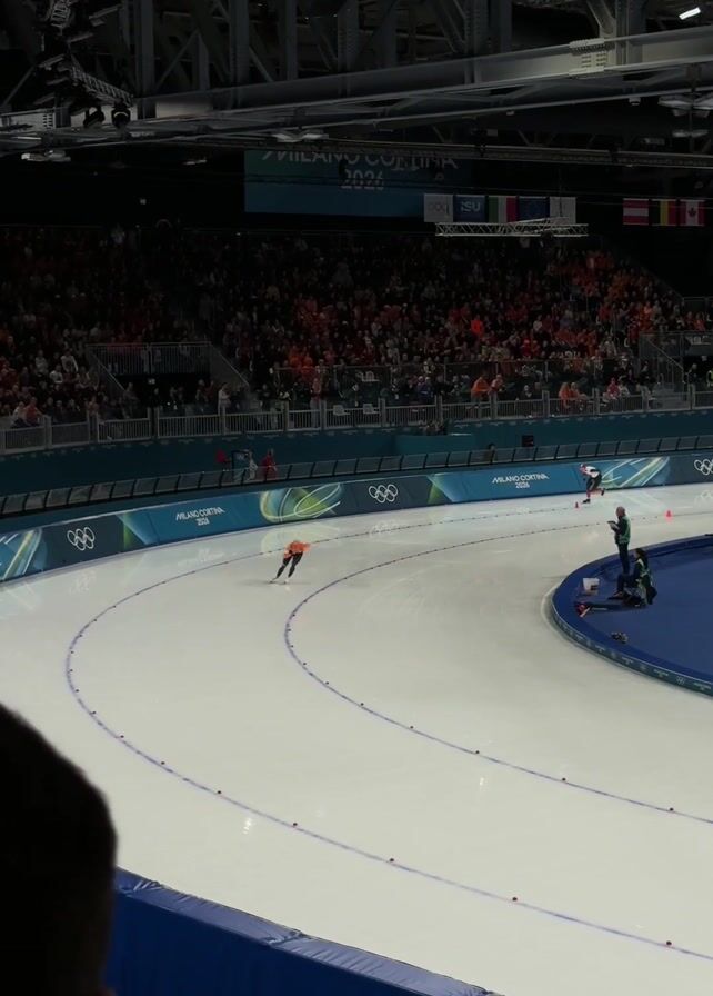 two speed skaters racing on an indoor ice track. The camera is positioned at an elevated angle overlooking the track, with part of the head of a person in the lower left corner, giving the impression the video was recorded from the stands. One skater wears an orange suit and the other wears a red and white suit. They are gliding in a counterclockwise direction around an oval ice rink, moving along a line marked in blue. In the background, there are rows of spectators filling the stands, and above them, a visible architectural structure of a large indoor arena with overhead lighting. Near the track, there is a man wearing a green jacket, seemingly observing or monitoring the race. A sign that reads "MILANO CORTINA 2026" indicates the location and the event associated with the venue. Flags are hanging above the spectator section.