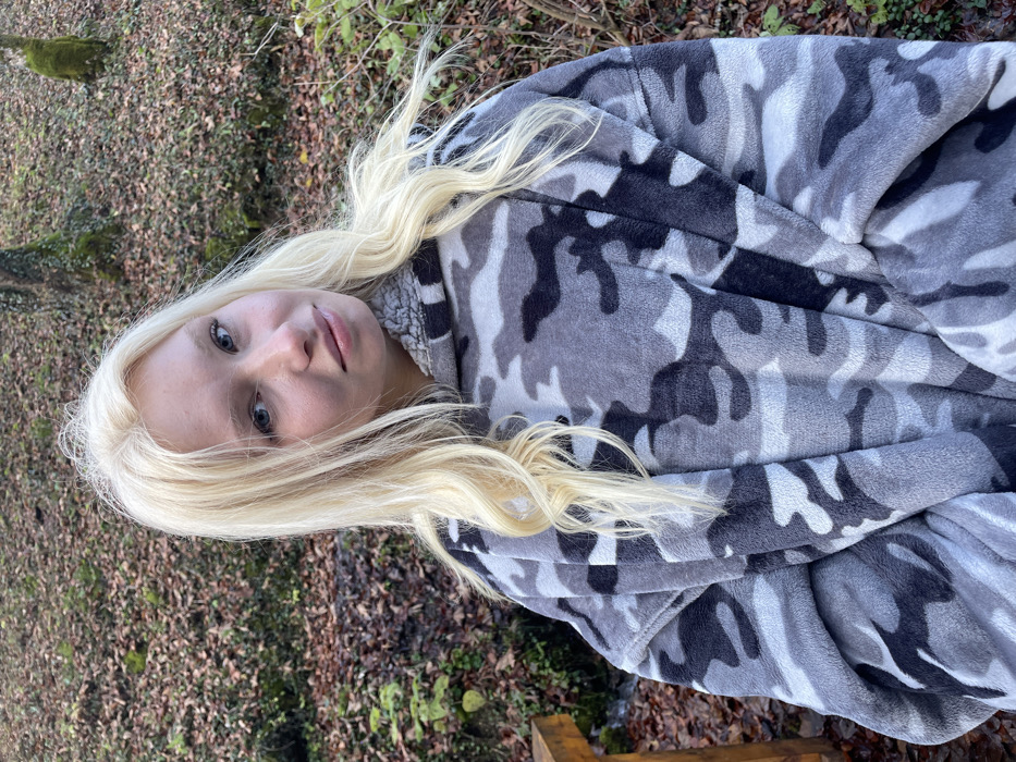 A young blonde female is depicted in a medium shot, centered slightly left, looking directly at the viewer. She has light blue eyes, a fair complexion, and long, wavy blonde hair that reaches her chest. Her lips are slightly parted with a glossy finish, and her expression is neutral to subtly smiling. She is wearing an oversized, hooded, plush garment patterned in a grey camouflage print, consisting of dark grey, medium grey, and light grey shapes. The inner lining of the hood, visible around her neck, is a light grey, sherpa-like fleece. The scene is set outdoors in a natural, wooded environment, located in Bistrica, Montenegro. The background is covered with an abundance of brown, fallen leaves, indicative of autumn or early winter. Several tree trunks are visible, some partially covered in green moss. In the lower-left corner, a segment of a light brown wooden structure, possibly a bench or railing, is present. Behind this structure and further into the background, a small stream or body of water can be discerned, bordered by rocks and sparse green vegetation. The lighting is diffused, suggesting an overcast day or a shaded area within the woods.
