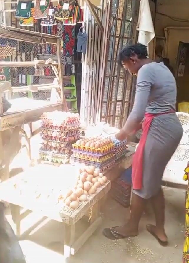 woman with braided hair wearing a gray long-sleeved dress, a red apron, and sandals standing at an outdoor market stall selling eggs. She selects eggs from a tray on a wooden table piled with several stacks of egg cartons. Another woman stands nearby, wearing a light blue t-shirt and black pants, holding a plastic bag. The stall is cluttered with items including fabrics, bags, and a white plastic fan. Street sounds and voices are audible in the background.