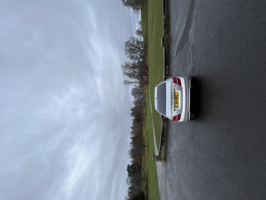 A silver car is parked on a wet paved surface, possibly asphalt, with a green field to the left. Bare trees line the field. A gray, overcast sky fills the background. The car's license plate is visible and reads "R4 RPC". The perspective is slightly elevated, and the image is rotated counterclockwise.