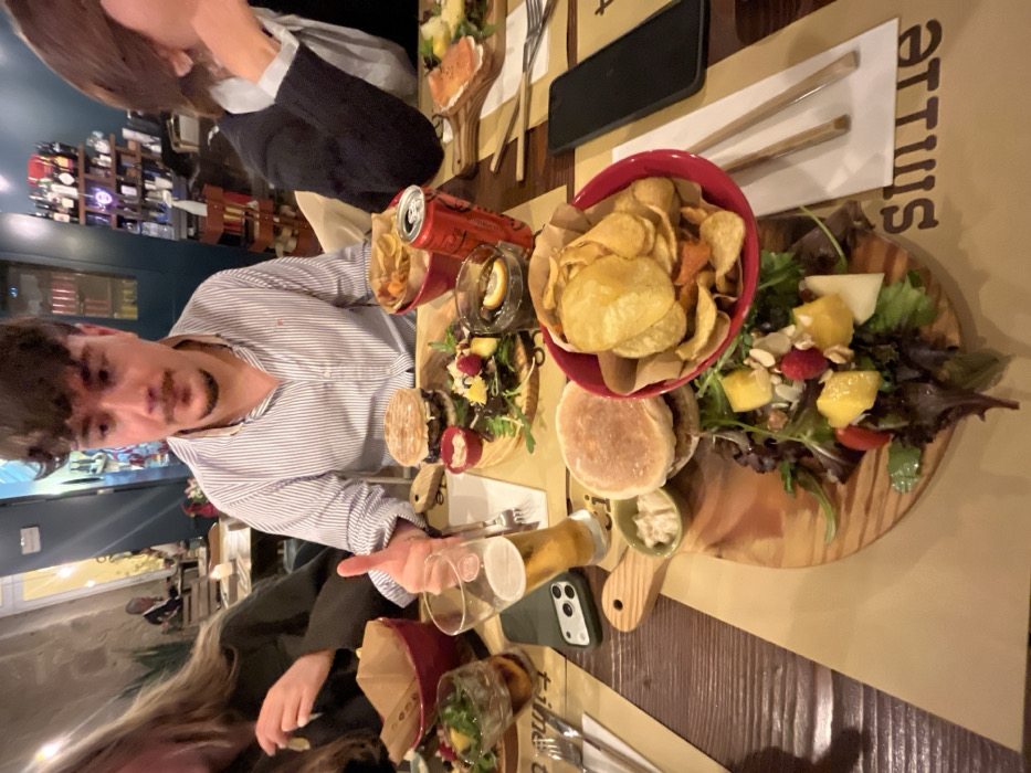 The image depicts an indoor restaurant scene in Braga, Portugal, featuring at least three individuals seated around a wooden table with multiple meals. In the foreground, a young adult male with dark hair and a light blue striped shirt is centered, looking directly forward. He has light stubble and holds a silver fork in his right hand, positioned over a wooden serving board. To his left, the side of a person's head with long, light brown hair and a dark top is visible. To his right, the shoulder and arm of another person in a dark jacket are partially seen. The table is covered with light brown paper placemats, some displaying the word "SMILE" in a stylized font. Several meals are served on individual wooden cutting boards. Each visible meal consists of a burger in a bun, a small red bowl containing a mixture of yellow and orange potato chips, and a side salad. The salads contain mixed greens, mango cubes, cherry tomatoes, raspberries, sliced almonds, and what appears to be white cheese. Small white ramekins with a light-colored condiment are also present on each board. Beverages on the table include a tall glass of amber-colored beer, a tumbler with a dark liquid and a lemon slice, and a red Coca-Cola can. Another glass with a dark liquid is visible on the far left. Two smartphones are on the table: a light green/grey device (possibly an iPhone with three cameras) near the beer glass and a dark-colored smartphone on the far right. Utensils, including forks and knives, are present. The background shows dark blue/green walls with shelves stocked with numerous bottles of what appear to be wine or spirits on the right side. On the left, a blurred background reveals a textured stone wall and another table with patrons seated. Overhead lighting fixtures are also visible.