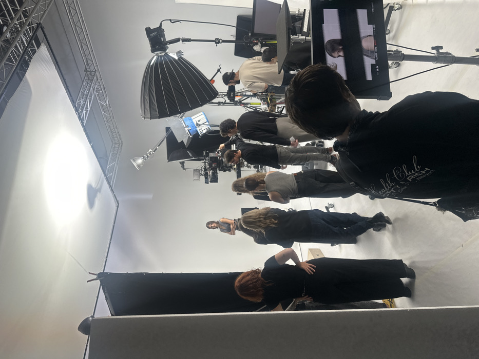 This image depicts a professional film or photography studio production located in Saint-Denis, France. The scene is set on a white seamless cyclorama background that extends from the floor to the wall, illuminated by multiple studio lighting units. These include a large parabolic softbox with a grid and smaller lights with reflector dishes, one featuring a visible blue gel, all mounted on stands. An overhead truss system supports additional lighting. Nine individuals are visible within the studio. At the center of the white background, a female model with dark hair, dressed in a dark sleeveless top and dark pants, stands with her arms crossed, posing. In front of the model, a large professional video camera is mounted on a tripod, operated by a male crew member in a black long-sleeved shirt and grey pants. Surrounding the camera, several other crew members are observing the scene: a person with reddish, curly hair in black attire, a person with long blonde hair in dark clothing, two additional males in black shirts and grey pants, and a person in a grey tank top and dark pants. To the right, a male in a light tan t-shirt and baseball cap stands next to additional equipment, while another partially visible individual is seated at a monitor station. In the immediate foreground, with their back to the viewer, a person wearing a black sweatshirt with "Health Club Sporty & Rich New York" printed on it is observing a rolling monitor display that shows a real-time feed of the model. Black V-flats or sound blankets are positioned vertically on the left side of the frame. The environment is a controlled studio setting actively engaged in visual media production.