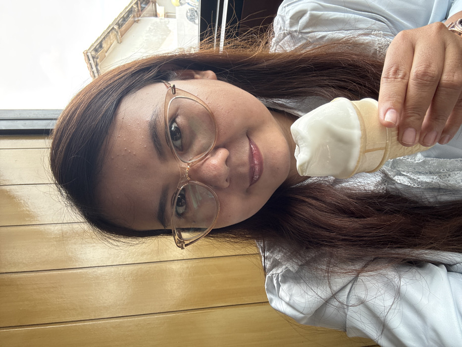A woman with long brown hair and glasses holds a small, white ice cream cone