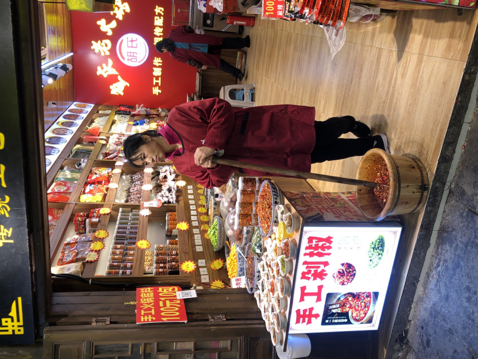 A storefront in a commercial area within Shapingba District, China, displays a variety of food products