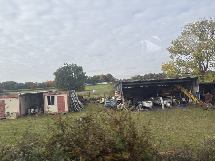 The image captures a rural outdoor scene in Vendenheim, France, under an overcast sky. In the foreground and midground, a green grassy field predominates. On the left side, two adjacent portable structures resembling cabins or sheds are positioned on the grass. The left structure has an open side revealing an interior with obscured contents. The right structure is beige with a red door and a single horizontal window. A stack of wooden boards and debris leans against its right side. To the right of these cabins, an open-sided metal-roofed structure, consistent with a large shed or barn, is filled with various objects. A prominent yellow excavator arm and bucket are visible on the right side of this structure, partially extending outside. Within the shed's interior, an assortment of items includes white rectangular objects (potentially sections of boats or large tanks), blue buckets, various tools, and other indeterminate machinery parts and clutter. The background consists of a tree line with some foliage displaying autumn colors. Faint white structures are visible on the distant horizon. A purple-wrapped bale is situated in the mid-distance, right of the cabins. The sky is uniformly covered by gray clouds. Reflections are present in the upper right quadrant, indicating the photograph was taken through a transparent barrier. No individuals are depicted, and no active interactions or specific actions are occurring.