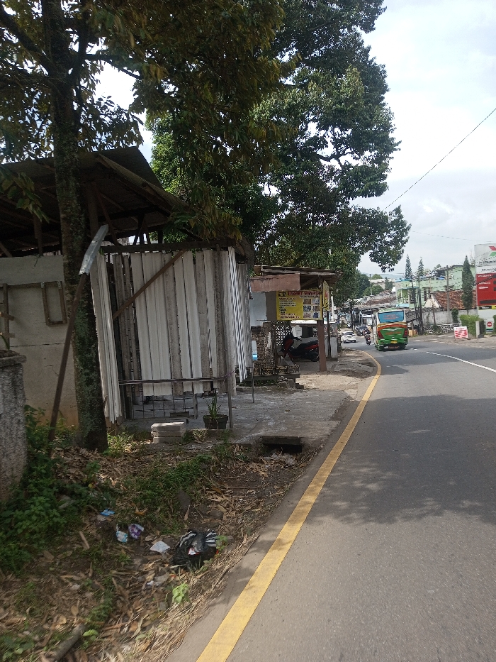 This image depicts a roadside scene within the city of Chhenangri_Rishor, Bhutan, captured during daytime under an overcast sky. In the foreground, a patch of dry earth with sparse green vegetation and scattered litter, including plastic bags and wrappers, is visible on the left. An asphalt road with a solid yellow line delineating its left edge dominates the lower right portion of the image. Tree shadows are cast upon the asphalt. Midground elements on the left include a large tree with dark, textured bark and dense green foliage. Adjacent to this tree stands a makeshift or informal structure with a sloped, corrugated metal roof and vertical white corrugated panels forming a partial enclosure. A diagonal wooden beam reinforces this structure, and metal railings are present at its base. To its right, a smaller, open-fronted stall or kiosk features a flat, light-colored roof. The back wall of this stall displays multiple posters with text in what appears to be Bahasa Indonesia or a similar Southeast Asian script. A dark-colored motorcycle is parked beneath this stall. On the ground near the stall, stacked concrete blocks and a small potted plant are present. A concrete sidewalk or paved area runs in front of these structures, containing a visible rectangular drain opening. On the asphalt road, a green and orange (or yellow) public transit bus is observed moving away from the viewer on the right side. Several other vehicles, including cars and motorcycles, are visible further down the street, indicating ongoing traffic. The background reveals numerous buildings of varying sizes and architectural styles lining the road, suggesting a commercial or mixed-use urban area. A large red sign with white lettering is partially visible on the far right. Dense green trees and foliage are interspersed among the structures, and distant hills or mountains are faintly discernible beneath the cloudy sky. No distinct human figures performing specific actions are visible in the immediate foreground or midground.