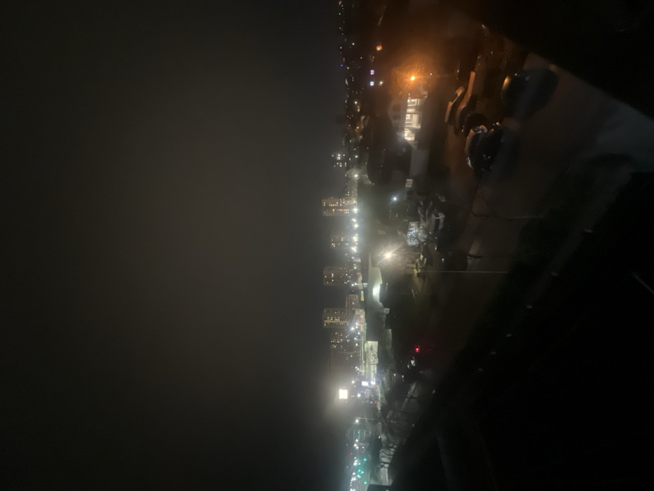 The image displays a nighttime, elevated panoramic view of an urban area within Plovdiv, Bulgaria. The immediate foreground is occupied by dark, indistinct building elements. Below, a major road or boulevard stretches across the midground, featuring multiple lanes and illuminated by numerous streetlights. Parked vehicles line sections of the road and a dedicated parking lot on the right, while one vehicle with illuminated red tail lights is visible on the road. Traffic lights on the left display green and red signals, adjacent to a brightly lit commercial sign. Trees lining the road appear bare, suggesting a colder season. In the distant background, a cluster of several prominent, multi-story residential towers with illuminated windows forms the skyline, their forms somewhat softened by atmospheric haze or low visibility. The sky overhead is uniformly dark, devoid of celestial bodies, characteristic of a heavily light-polluted urban environment at night. No individuals are distinctly visible.