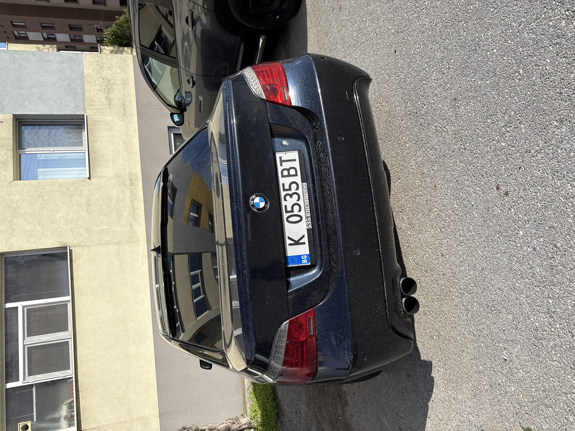 The image depicts the rear of a dark-colored BMW car, parked on an asphalt surface near a building