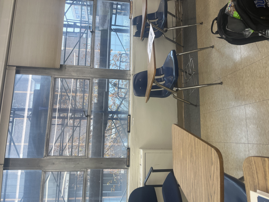 A classroom scene shows a large window with a partially drawn blind revealing a street view. Rows of student desks with attached blue chairs fill the room. A backpack sits atop one desk. The floor is tiled in a neutral tone. The room appears empty and still.