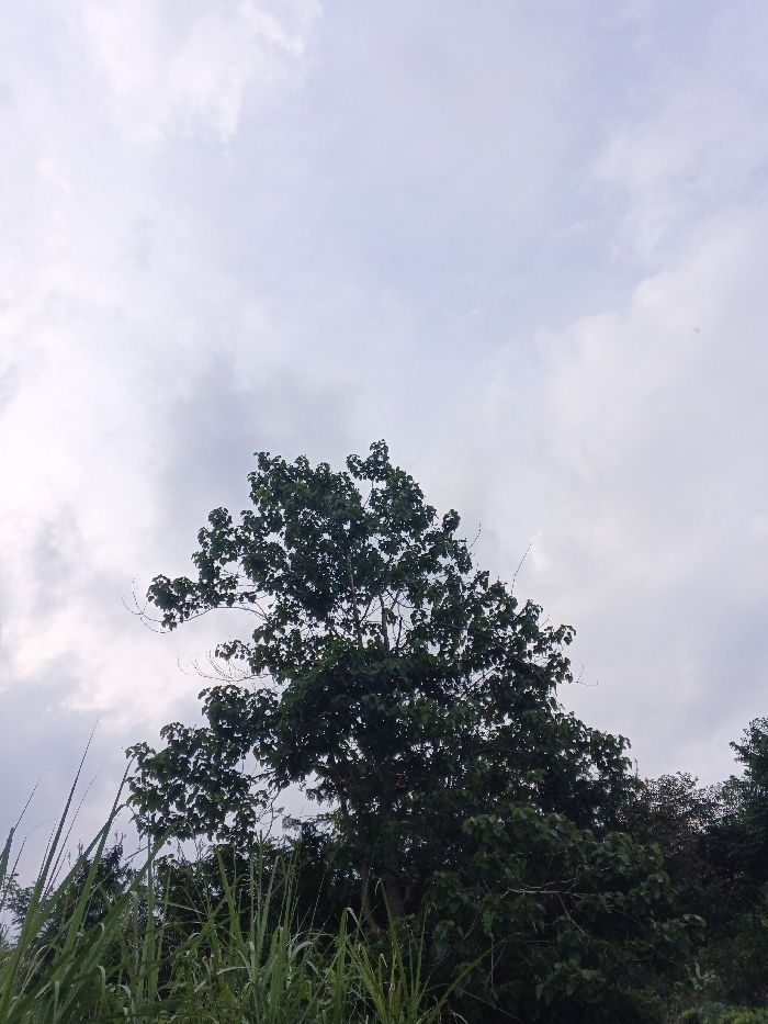 The image displays an outdoor, vegetated scene under an overcast sky. The upper two-thirds of the frame are dominated by a sky filled with diffuse, light gray and white clouds. A large tree with dense, dark green foliage occupies the lower-middle and right sections of the image, with its branches extending into the cloudy expanse. Some bare, finer branches are visible on the left side of the tree's canopy. In the lower-left foreground, tall, slender blades of green grass or reeds rise vertically. Additional dense green foliage and tree canopies are visible behind the primary tree, particularly on the right. No human subjects, man-made structures, or specific identifiable landmarks are present. The precise location within the city of Đà Nẵng, Vietnam, cannot be determined from the visual information provided.