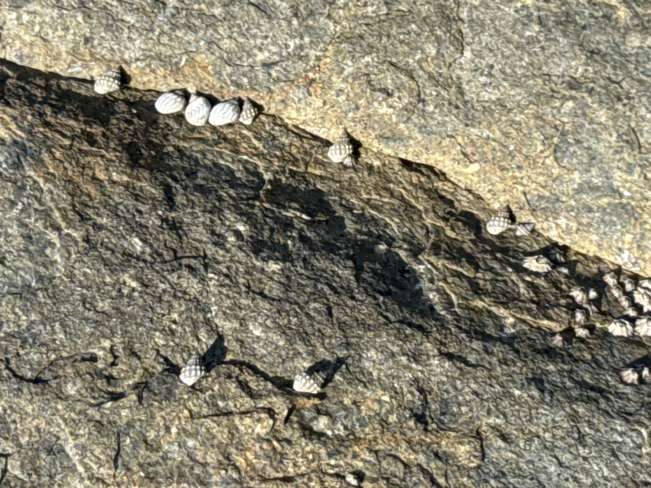 The scene depicts a close-up, high-angle view of a textured rock surface located in Vĩnh Lương, Vietnam. The rock exhibits varying shades of dark gray, brown, and muted green, with prominent fissures and irregular cracked patterns across its rough surface. A distinct, roughly diagonal fracture runs from the upper right quadrant towards the lower central area, creating a visual division in the rock's composition. Attached to and distributed across this rock surface are numerous small marine gastropods, likely periwinkles, or similar intertidal snails. These organisms possess conical or spiral shells, predominantly light gray or off-white, with subtle darker striations or patterns. On the right side of the main diagonal fracture, a vertical arrangement of five individual shells is visible, closely spaced. Additional individual shells are scattered across the left and central portions of the rock, often situated along smaller cracks. A denser cluster of smaller organisms or barnacles is present in the lower central region. Direct, strong illumination, consistent with sunlight, highlights the rock's texture and casts subtle shadows from the attached organisms, indicating light source from the upper left. No human presence or active interactions are observed; the organisms remain static on the rock substrate. The environment suggests an exposed coastal or intertidal zone.