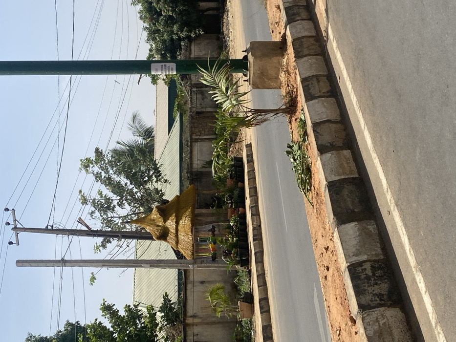 The image displays a daytime street scene in Kabala, Nigeria. In the mid-ground, a small, multi-tiered structure with a conical, yellow-gold thatched roof stands on a dirt area adjacent to a paved road. Numerous plants in black plastic pots and terracotta containers are arranged around the base of this structure, and several colorful hanging planters are suspended from its lower eaves. A two-lane asphalt road occupies the foreground and mid-ground, featuring a white painted line along its right edge. This road is bordered by a concrete median composed of blocks painted alternately black and white. The median's top surface is reddish-brown soil. A small, sparse palm-like plant grows from this median, and a cluster of green plant cuttings lies on the soil nearby. Further along the median to the right, a tall green metal pole with a rectangular white sign attached is anchored in a concrete base. In the background, behind a concrete perimeter wall topped with barbed wire, are several single-story buildings with light-colored corrugated metal roofs. Various green trees are scattered throughout the background, partially obscuring the buildings. Two utility poles, one concrete and one wooden, stand in the background on the left, supporting multiple overhead power lines against a clear blue sky. No individuals or vehicles are present in the scene.