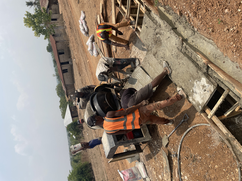 The image depicts an active construction site in Osara Gada, Nigeria, under a clear, bright sky