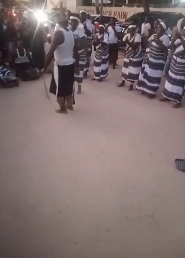 In a full shot, a group of people participate in an outdoor dance. Most of the dancers, dressed in long striped garments, white head coverings, and matching white tops, form a circle. One man in the center, wearing a white tank top and a black skirt, dances with a whip in his hand. There are spectators standing on the periphery, and the event appears to be taking place on a sandy, uneven surface. The lighting is bright, and the overall atmosphere suggests a cultural or ceremonial gathering.