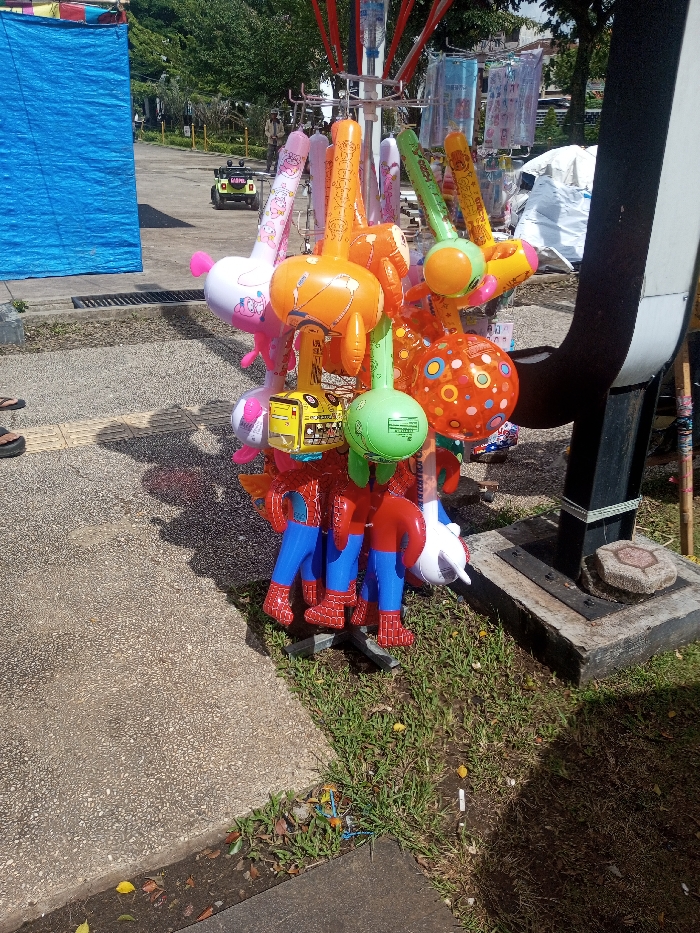 A colorful balloon stand displays an assortment of inflatable toys. Character shapes like Spiderman and cartoon animals are prominent. The stand is placed on a patch of grass next to a paved area. In the background, a blue tarp and a small electric car are visible. The scene is captured in daylight, creating a bright and lively atmosphere.