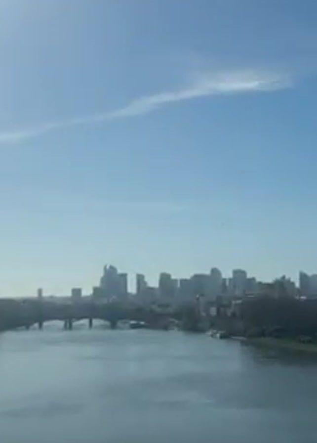 A body of water with a skyline on the horizon under a sunny blue sky. The water is calm and reflects the sunlight. There are two bridges visible in the distance. There is a white contrail in the sky. The camera is static and the scene is captured from an elevated position, possibly from another bridge or tall building. A railing is partially visible at the bottom of the frame.
