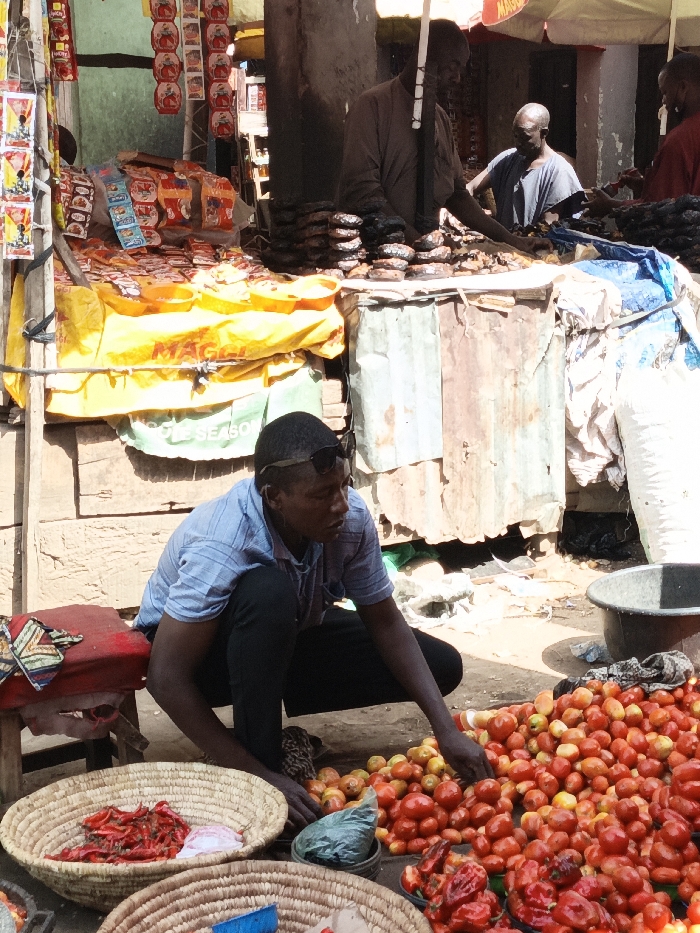 The image portrays an outdoor market scene in Sabon Gari East, Nigeria