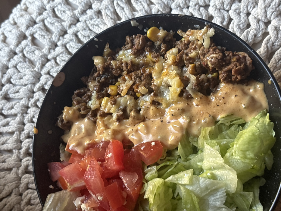 A bowl of food sits on a woven surface. The meal includes ground beef with melted cheese and corn. Below, there is a creamy orange sauce, chopped tomatoes, and green lettuce. The bowl is dark in color and appears to be partially filled.