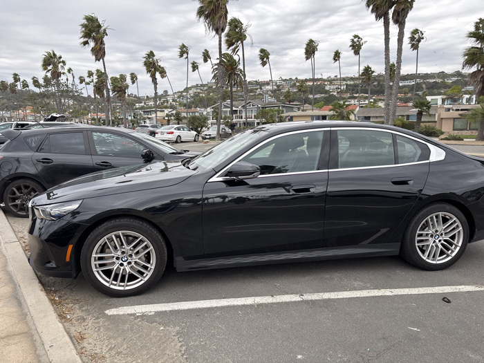 A black BMW sedan is parked in a parking lot. The car is positioned close to the curb on the left side of the frame. In the background, a line of palm trees is visible, extending towards a hill with houses. Other parked cars are also present in the background, near the horizon. The sky above is overcast, suggesting a cloudy day.