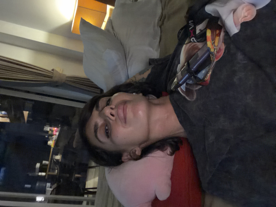 The scene is observed to be located in Nusa Dua, Indonesia, within an indoor space at nighttime. A female subject, appearing to be an adult, is lying supine on a bed, looking directly at the camera. She has dark hair and dark eyes, with a slight pouting expression and her tongue subtly protruding. Her skin exhibits a sheen, possibly from sweat or oil. She wears a dark, possibly charcoal grey, short-sleeved t-shirt with an indistinct graphic on the chest and a tattoo visible on her left arm. A dark cylindrical object, resembling a vaping device, is resting on her chest, partially obscured by colorful fabric and a white item. Her head is supported by a light-colored pillow, with a pink plush pillow positioned to her left. The bed is covered with light-colored bedding, including a white pillow and a red pillow beneath the pink one. To the right of the subject, a warm, amber-toned lamp with a square shade illuminates a light-colored wall. Behind the subject, a large window or glass door overlooks a dark exterior scene with scattered artificial lights, indicative of an urban or developed area. Vertical blinds, partially tied back, are visible on the right side of the window frame.