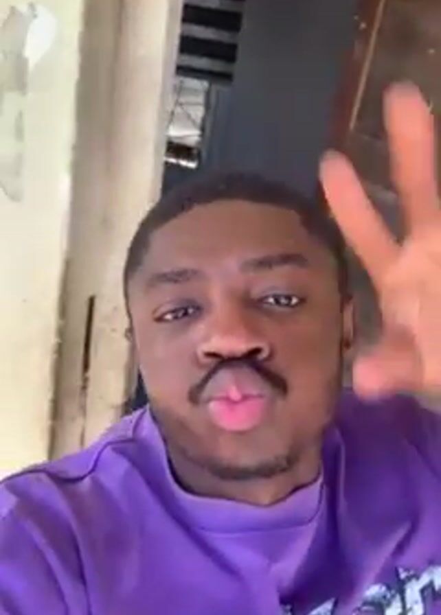 A young man wearing a purple t-shirt is holding the camera and looking directly at it. He is making a series of gestures with his hand: first he shows five fingers, then three, and then makes an "OK" sign. His lips are puckered out in a kissing gesture throughout the video. The background shows a partially open wooden door, a window with closed blinds, and a room with a chair and other objects in the distance. The lighting is natural and appears to be daytime.