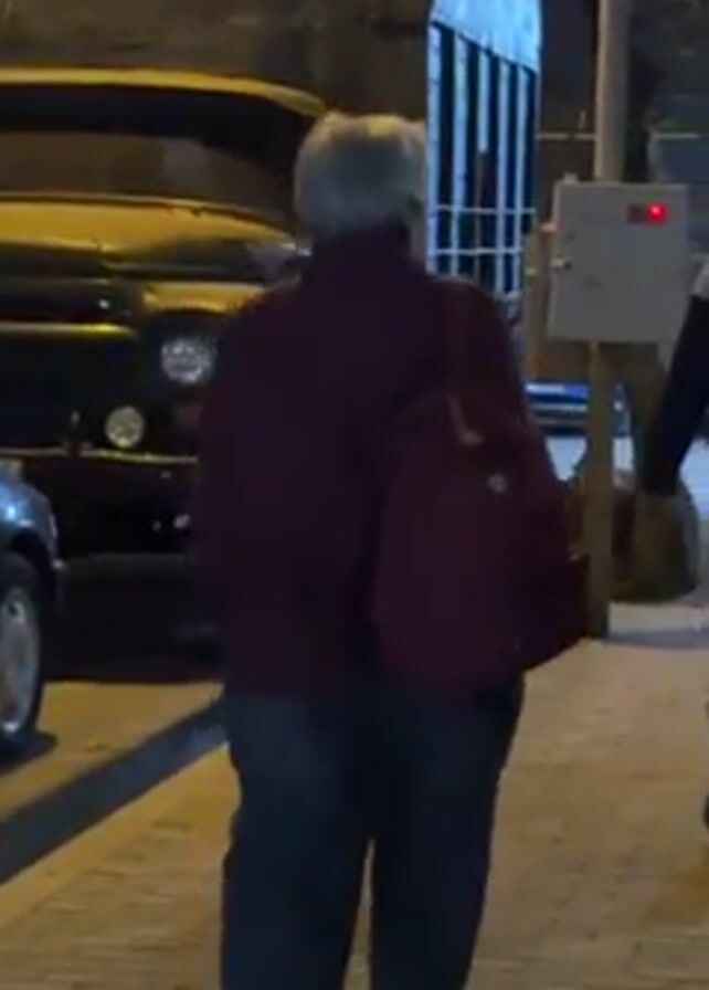 A person with short gray hair and a maroon jacket is walking away from the camera on a brick sidewalk. They are wearing jeans and carrying a red backpack. To the left is a dark vehicle, possibly a Jeep, and behind the person is a large truck with a dark cover. A light pole and another person are partially visible on the right side of the frame. The scene appears to be at night, with the street lit by artificial lighting.