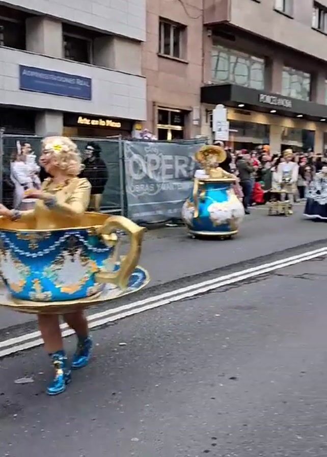 A parade of people in costume, some wearing tea-cup and tea-pot themed outfits, are walking down a paved street