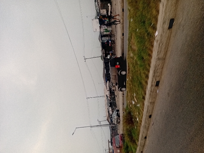 A street scene shows a mix of commerce and transit. A dark car parks on the edge of the road. Pedestrians walk near stalls or shops lining the street. Power lines stretch across the sky. A concrete barrier with patches of grass divides the road from the pedestrian area. The sky is overcast, suggesting a cloudy day.