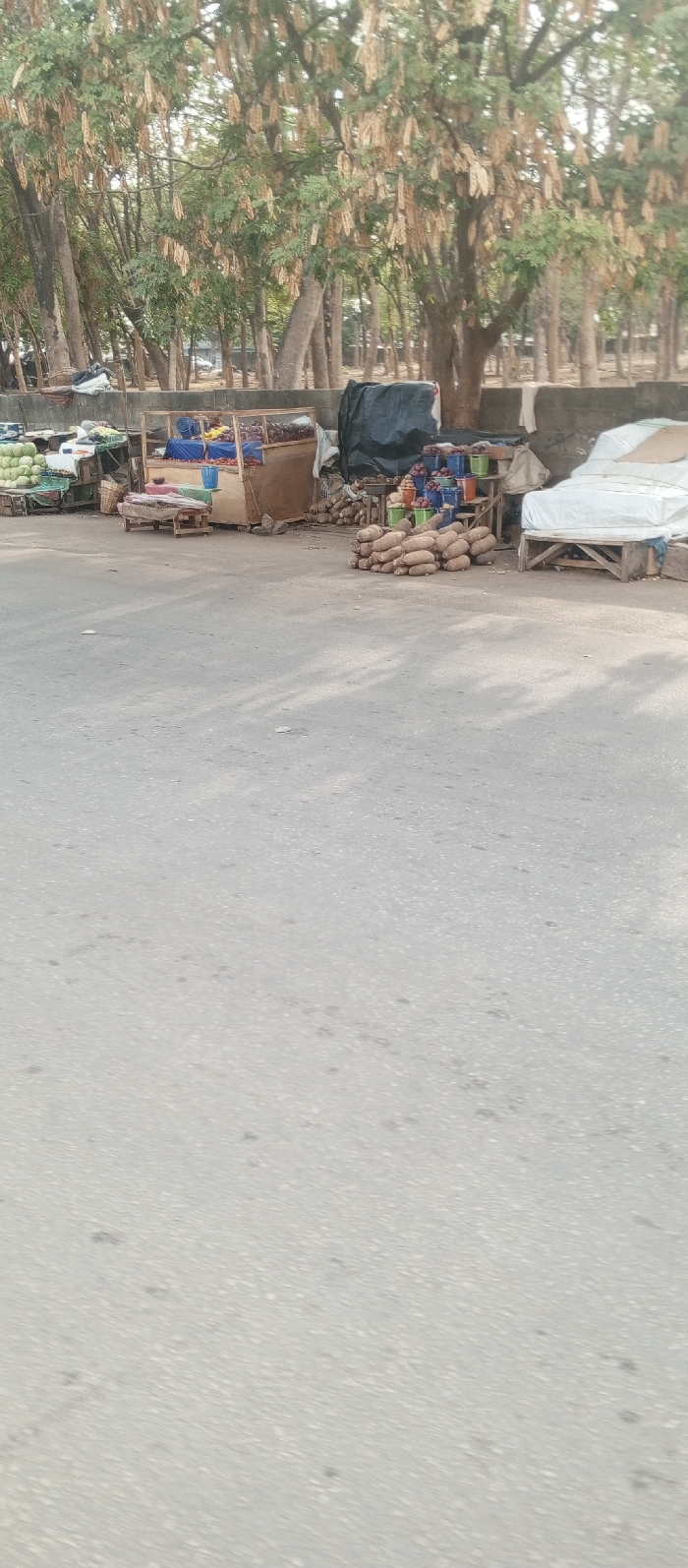 The image displays a roadside market scene in Kubwa, Nigeria, under natural daylight