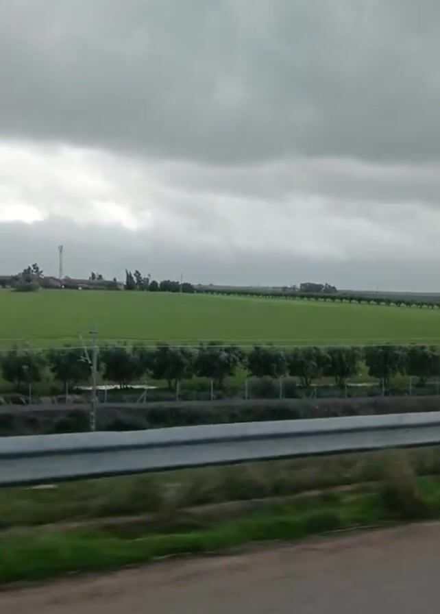 landscape on a cloudy day, shot from a moving vehicle. In the background, a large, flat green field stretches towards the horizon. A row of trees separates the field from what appears to be a railway line with overhead wires and posts. A guardrail lines the road in the foreground. The sky is overcast with dense gray clouds. There is faint audio present consisting of conversation in a language other than English.