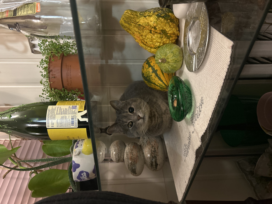 - "A gray cat sits amidst a cluttered glass shelf" by FM-FmE2k1, licensed under CC BY 4.0