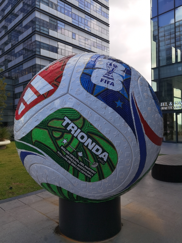 A large, multi-colored soccer ball sculpture stands centrally on a short, black cylindrical pedestal in an urban outdoor plaza in Holon, Israel. The spherical sculpture is predominantly white with textured panels featuring embossed stars and shell patterns. It displays prominent branding, including a blue panel with the FIFA World Cup trophy logo and "FIFA" text, and a green panel with "TRIONDA PRO," "OFFICIAL MATCH BALL" in three languages, a Canadian maple leaf, and a feather emblem. Abstract red and blue designs adorn other panels. The sculpture is positioned on light grey paving, adjacent to a manicured grass area with a light-colored planter on the left. In the background, two modern, multi-story buildings with glass and concrete facades rise under an overcast sky. The building on the left is a grid-patterned structure, while the building on the right reflects the sky and features partially visible signage. A dark, segmented round bench is partially visible on the paved area to the right of the sculpture. No individuals are present.