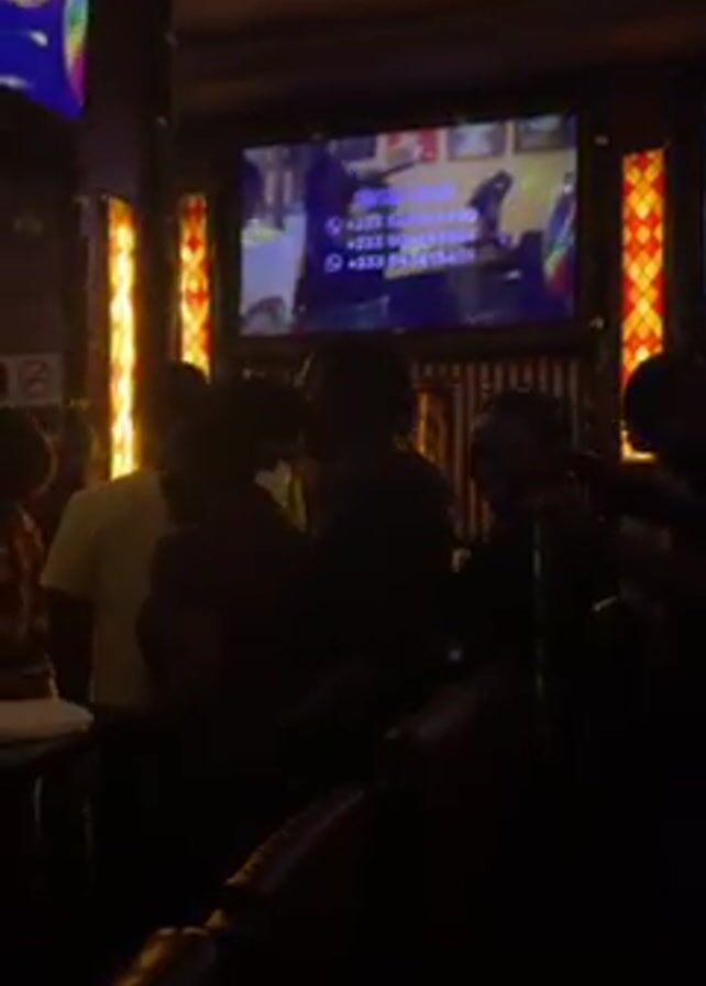 In a dimly lit bar setting, a group of people are gathered, their attention focused on a large screen displaying a live performance