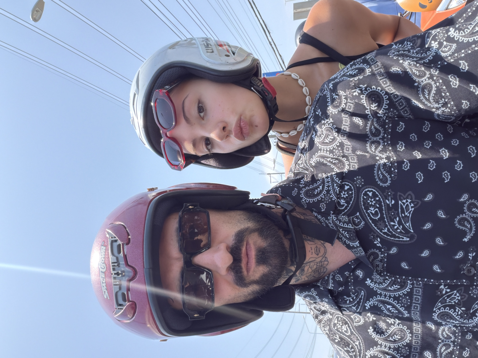 A selfie photograph captures two individuals outdoors on a sunny day in Wichit, Thailand. In the foreground, a male with a dark beard and mustache wears a maroon "SPACE CROWN" open-face helmet, dark rectangular sunglasses, and a black short-sleeved shirt featuring a white paisley pattern. Visible tattoo artwork extends from his neck. He looks directly at the camera. Behind him and to his right, a female with dark hair wears a light grey open-face helmet with red hexagonal sunglasses pushed up onto the helmet. She has a white shell necklace and a black tank top, with her lips puckered towards the camera. The background reveals a clear blue sky, overhead utility wires running horizontally, and a street light fixture on the upper right. Partial orange vehicle components are visible on the far right.