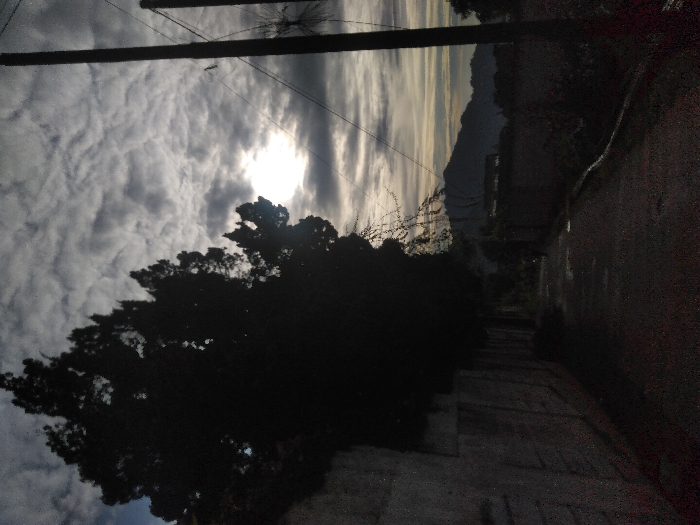 This image depicts an outdoor scene in the city of Røros, Norway. The sky is largely covered by textured altocumulus or stratocumulus clouds, with the sun partially visible on the right, creating a bright spot through gaps in the cloud cover. A tall, dark evergreen tree, likely a conifer, stands prominently on the upper left side, silhouetted against the sky. A light-colored, rough-textured wall, possibly concrete or stone, extends from the lower left foreground along the edge of a narrow, dark, unpaved or poorly maintained road that recedes into the distance. The road surface appears uneven and possibly damp. On the far right, two dark utility poles are present, silhouetted, with faint overhead wires visible. In the distant background, beyond a low structure and some vegetation, a range of mountains or hills is visible, appearing dark bluish-grey. The overall scene is dimly lit, casting much of the foreground and mid-ground elements into silhouette. No individuals or specific actions are discernible.