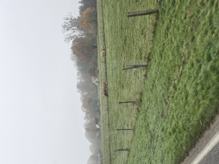 This image displays a rural landscape in Scheibenhard, France, under overcast conditions. The lower-left foreground shows the edge of an asphalt road with a white demarcation line, transitioning into a green grassy verge. The mid-ground is dominated by an expansive green pasture, segmented by a fence line featuring multiple wooden posts. Five brown cattle are present within this pasture, actively grazing; three are clustered on the left, and two are positioned further right. The background features a dense line of deciduous trees, exhibiting a mix of green and autumnal orange-brown foliage. Partially visible amidst these trees is a small building with a light-colored roof, likely a rural dwelling or farm structure, with additional indistinct structures observed further left within the tree line. The sky is uniformly light grey, indicating fog or extensive cloud cover, creating a muted visual palette.